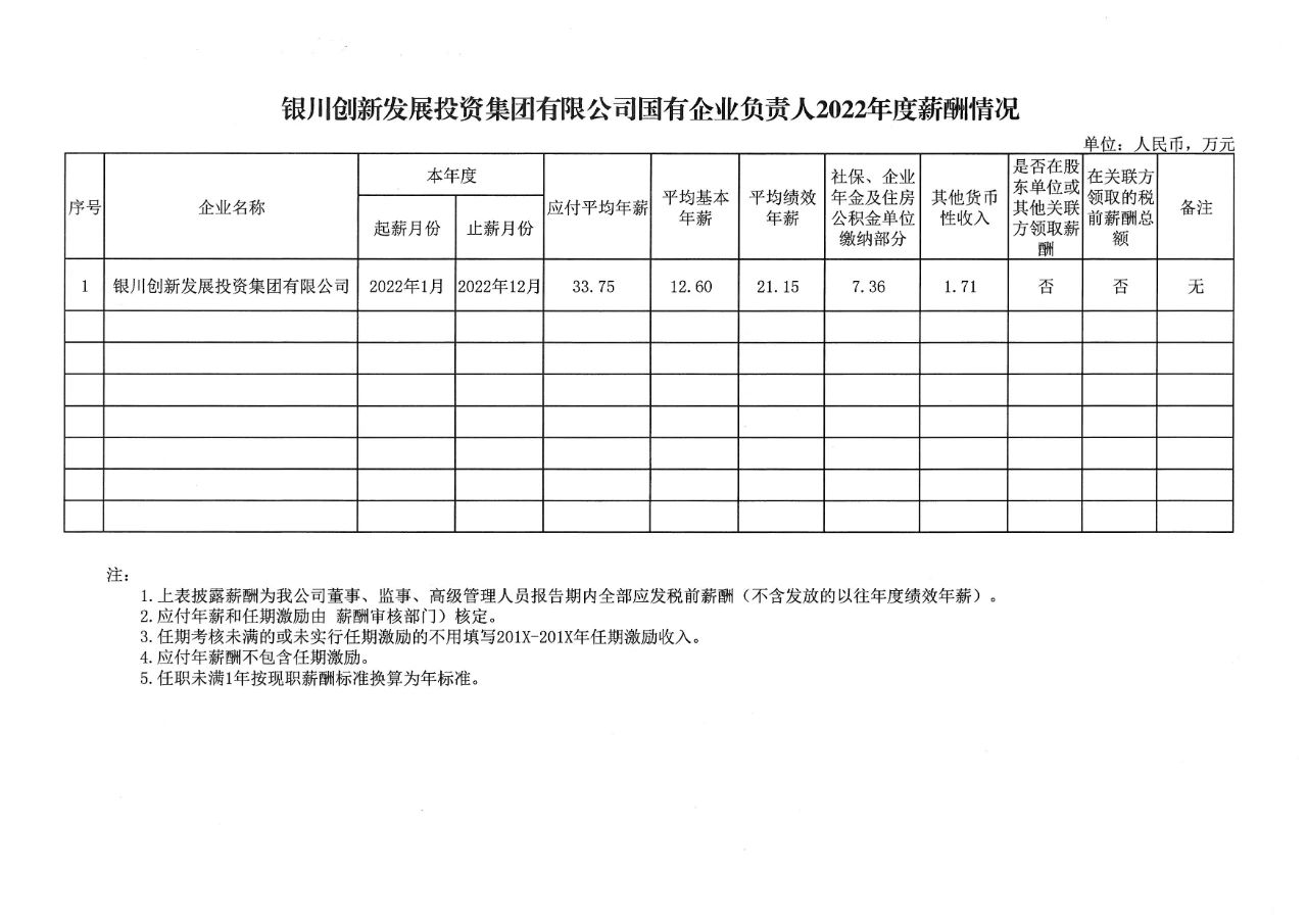 根據(jù)《銀川市屬國(guó)有企業(yè)負(fù)責(zé)人薪酬管理辦法(試行)》(銀國(guó)資發(fā)〔2021〕458號(hào))、《銀川市屬國(guó)有企業(yè)負(fù)責(zé)人經(jīng)營(yíng)業(yè)績(jī)考核辦法(試行)》(銀國(guó)資發(fā)〔2021〕459號(hào))、《銀川市屬國(guó)有企業(yè)負(fù)責(zé)人經(jīng)營(yíng)業(yè)績(jī)考核實(shí)施細(xì)則(試行)》規(guī)定,經(jīng)銀川市國(guó)資委核定,現(xiàn)將銀川創(chuàng)新發(fā)展投資集團(tuán)有限公司企業(yè)負(fù)責(zé)人2022年度薪酬信息予以披露。